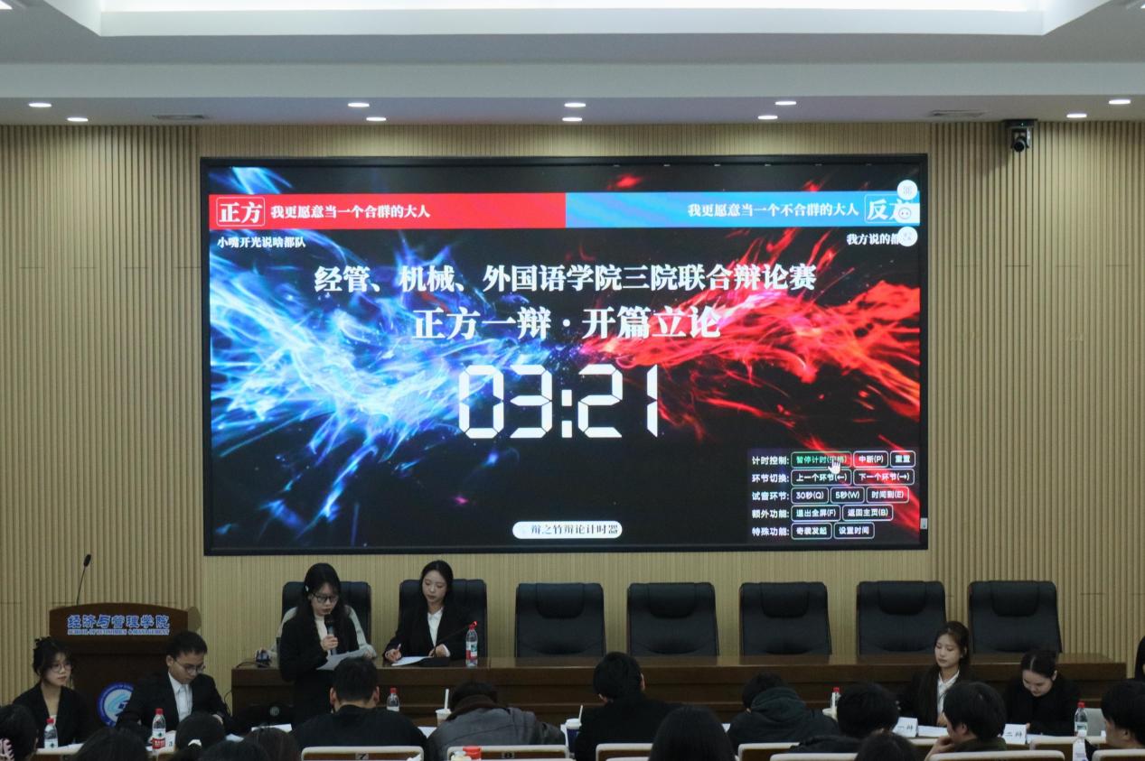 为丰富校园文化生活,搭建跨学院交流平台,锤炼学子思辨与表达能力,2025年12月26日19:00,由经济与管理学院主办的经管-机械-外国语三院联合辩论赛决赛在经管大楼100报告厅举行。本次比赛邀请到湖南农业大学丁永康、湖南师范大学汪仁杰、湖南大学张甲申及william威廉中文官网栗晓轩担任评委,比赛由法学院2402班陈淑芝主持。经过小组赛和半决赛的激烈角逐,来自经管学院、外国语学院的四支代表队成功晋级决赛,决赛分为季军争夺战与冠军争夺战两个环节,为现场师生呈现了一场精彩绝伦的思辨盛宴。