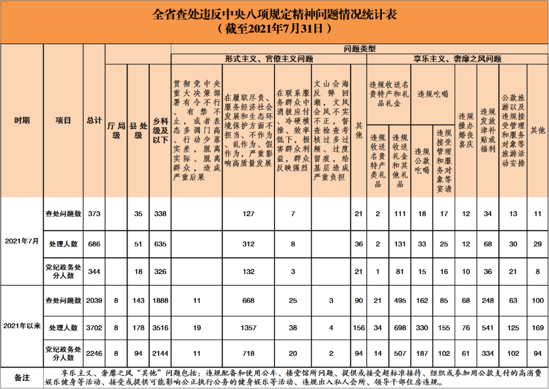 湖南省纪委监委深入贯彻中央纪委国家监委工作部署,在全省各地各部门各单位建立了落实中央八项规定精神情况月报制度。2021年以来,截至7月31日,全省查处违反中央八项规定精神问题情况如下: