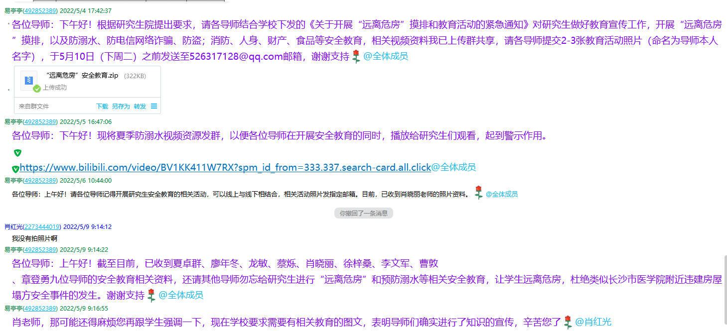 学院研究生辅导员研究生导师群里面下发通知,要求落实导师责任制,对研究生开展“远离危房”摸排,以及防溺水、防电信网络诈骗、防盗;消防、人身、财产、食品等安全教育导师们积极分配,利用线上和线下对全体研究生召开“‘远离危房’摸排和教育”相关组会,组织研究生认真观看学习了“生命重于泰山——学习习近平总书记关于安全生产重要论述”电视专题片,以及开展了对新修订《安全生产法》的学习。导师们排查了研究生五一假期返校情况,教育引导广大研究生坚决远离危房,禁止到校园周边各类安全条件不具备的场所特别是违章非法建筑物内聚集玩耍或消费。针对研究生外宿、外租房等情况进行全面摸排,引导研究生非必要不外租房,对于办理了相关手续的外租房研究生,在详细掌握研究生居住环境的基础上排查是否为违章非法建筑物,是否存在安全隐患,并做好相关工作