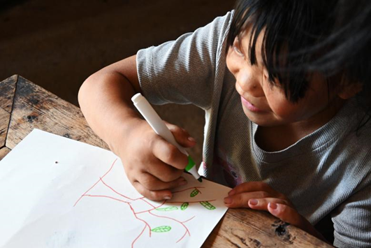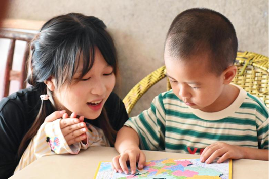 成员们带着大米、食用油等生活物资及书包、马克笔等文具,走进一户户特殊家庭。这些家庭中,有需陪伴关爱的留守儿童与需耐心引导的特殊儿童。成员们精心备好颜料、画纸和卡通石膏,陪着孩子们一同探索绘画的奇妙世界。他们不仅传授孩子们简单的绘画技巧,还鼓励孩子们大胆表达内心的想法。除了绘画,磁吸拼图等游戏也成为拉近与孩子们距离的桥梁。“从上往下,再换个角度,就能拼好了”,团队成员黄岚轻声引导着。“我想画树叶!”孩子们兴致勃勃地挥动画笔,在成员们的陪伴下,空白画纸渐渐变成五彩斑斓的“艺术品”。