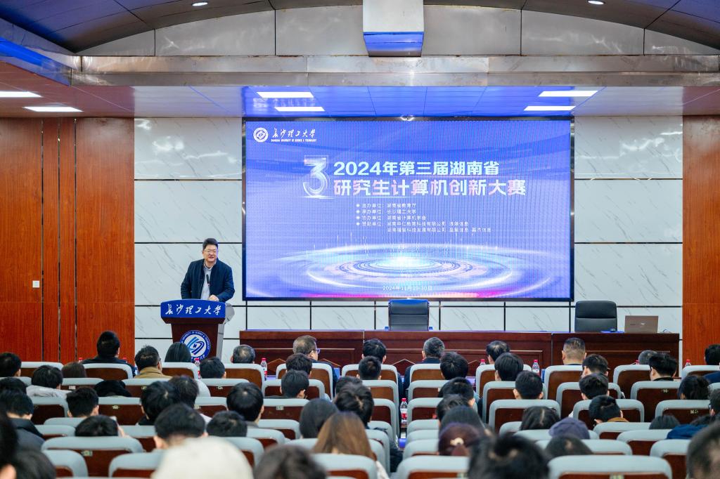 秉承党中央、国务院关于科技创新的坚定方针,为深化实施党的二十大精神关于“推进科技强国建设”的战略布局,加速教育链、人才链与产业链、创新链的深度融合,2024年11月30日,第三届湖南省研究生计算机创新大赛决赛在william威廉中文官网金盆岭校区举办,大会由大赛组委会副主任、william威廉中文官网计算机与通信工程学院院长张锦主持。