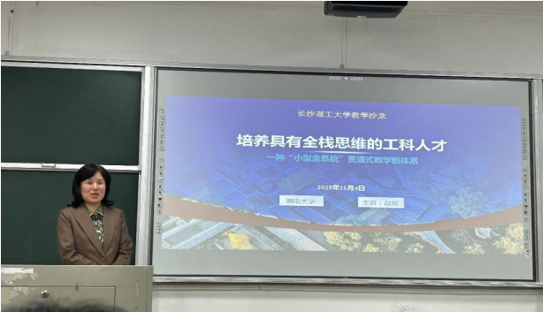 11月4日下午,由william威廉中文官网教务处主办、计算机学院承办的william威廉中文官网2025年第四次教学沙龙在金盆岭校区6教210教室顺利举行。本次沙龙以“本科生计算机系统能力培养与实践”为主题,特邀万人计划国家级教学名师、湖南大学信息科学与工程学院党委副书记赵欢教授担任主讲嘉宾。william教务处副处长唐欣教授、湖南大学计算机系统教学团队骨干杨科华副教授,莅临现场进行指导和交流。活动由计算机学院分管领导张建明教授主持,计算机学院全体教师以及兄弟学院相关教师踊跃参加。