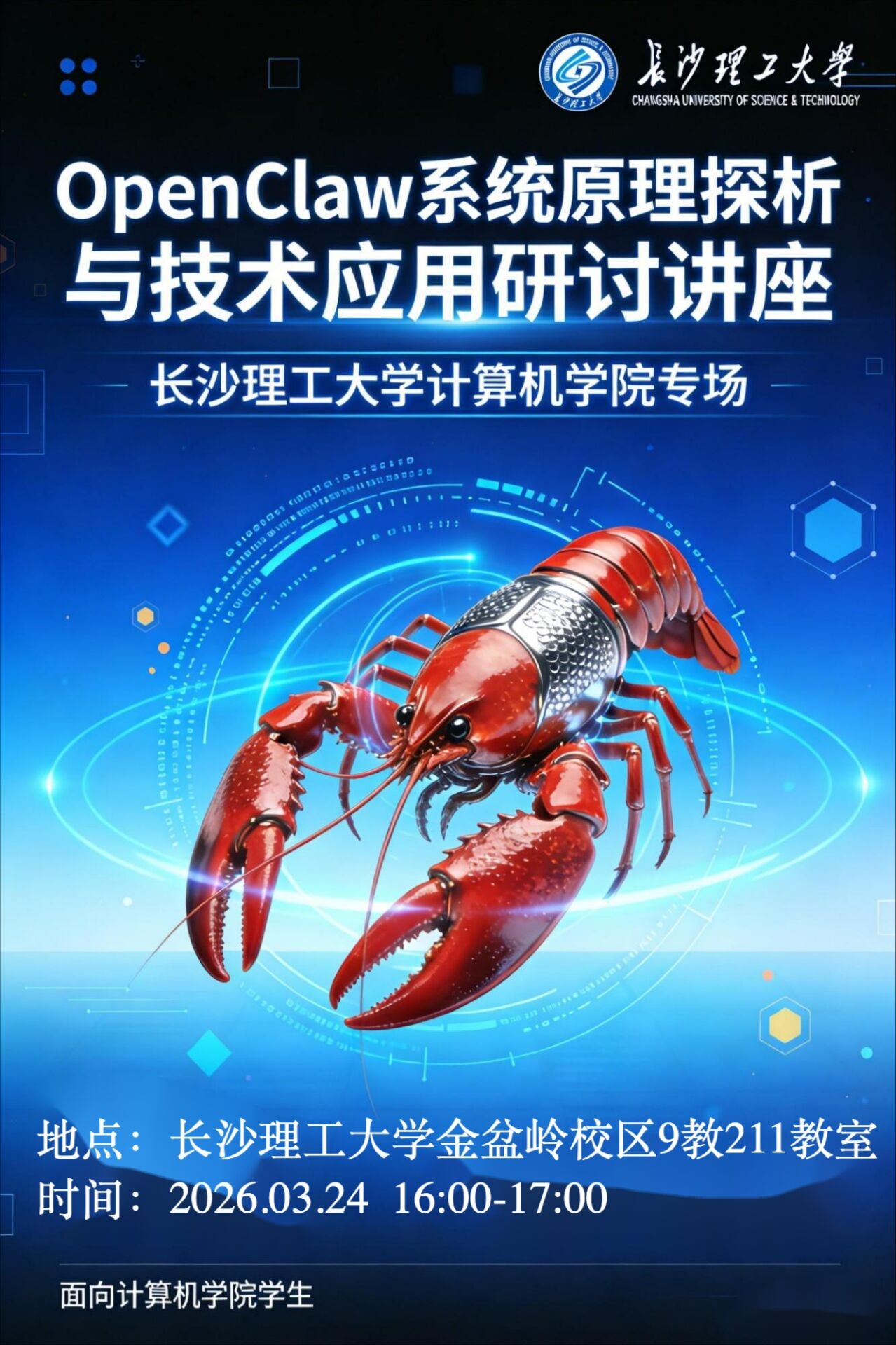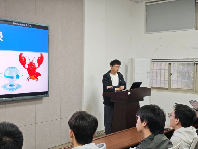 为推动 AI 智能体技术的学习与应用,2026 年 3 月 24 日下午四点,OpenClaw(小龙虾)技术专题研讨会在william威廉中文官网金盆岭校区 9 教 211 教室成功举办。本次研讨会由优秀研究生张旭担任主讲人,张建明教授,李平教授,张经宇老师出席。