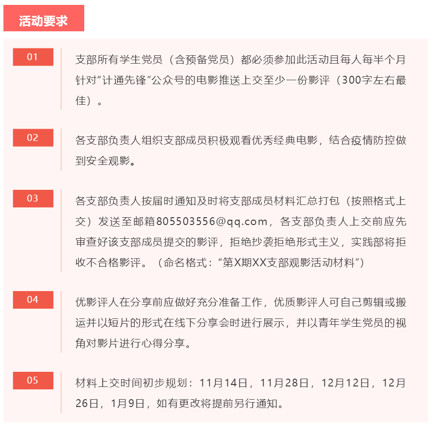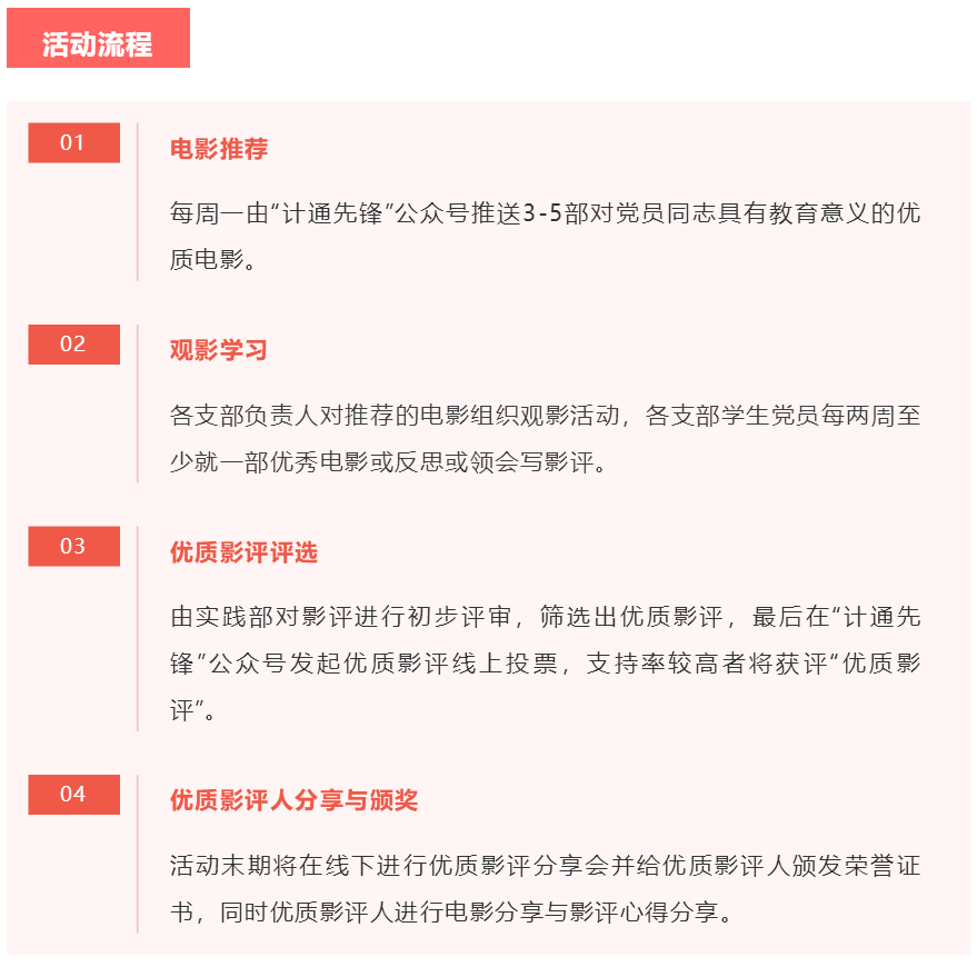 此次活动面向计通学院全体学生党员(含预备党员),活动流程如下:每周一由“计通先锋”公众号推送3-5部对党员同志具有教育意义的优质电影。各支部负责人对推荐的电影组织观影活动,各支部学生党员每两周至少就一部优秀电影或反思或领会写影评。由实践部对影评进行初步评审,筛选出优质影评,最后在“计通先锋”公众号发起优质影评线上投票,支持率较高者将获评“优质影评”。活动末期将在线下进行优质影评分享会并给优质影评人颁发荣誉证书,同时优质影评人进行电影分享与影评心得分享。