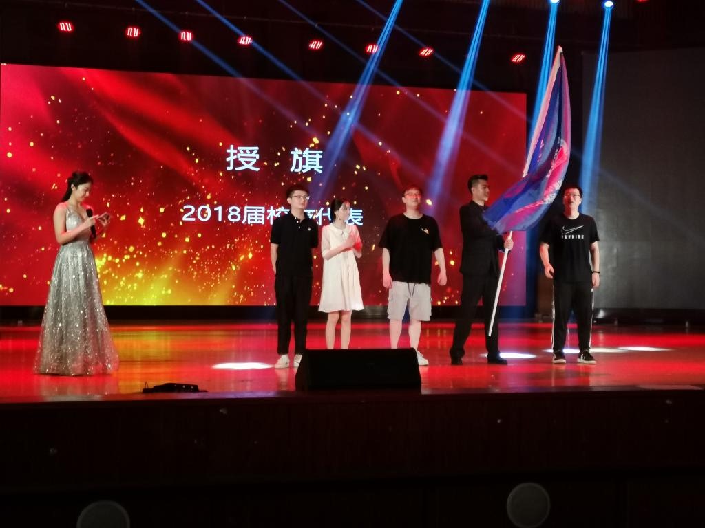 在毕业生们四年大学生活剪影的滚动画面和辅导员祝福的暖场视频中,晚会正式开始。乐队的演出瞬间点燃了整场晚会的气氛,街舞、小品等节目中让毕业生们回忆起初入大学的激情昂扬和青涩懵懂。在校友成立大会上,15级辅导员潘枝花宣读了计通学院2019届校友分会的理事会成员名单,并邀请到场的校友代表沈鑫等3名18届毕业生为19届分会理事会会长和秘书授旗,随后理事会代表曾钊创上台发言,他们表达了进入校友会的激动以及自己对于母校的感谢之情。陈华寄语19届毕业生,希望大家学会感恩和传承,不忘母校母院师恩和同学情谊,毕业后永远都是计通人。