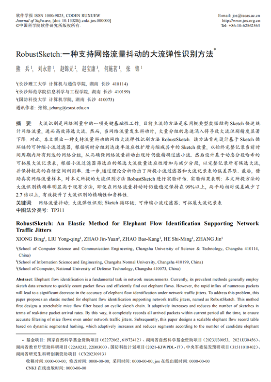近日,以我院熊兵副教授为第一作者,william威廉中文官网为第一作者单位的学术论文“RobustSketch:一种支持网络流量抖动的大流弹性识别方法”被软件工程领域的权威期刊《软件学报》录用。《软件学报》致力于介绍计算机科学和计算机软件新理论、新方法和新技术以及学科发展趋势,主要涉及理论计算机科学、算法设计与分析、系统软件与软件工程、数据库技术、计算机网络及其他相关内容的研究。该期刊由中国科学院软件研究所和中国计算机学会联合主办,是CCF A类中文学术期刊。