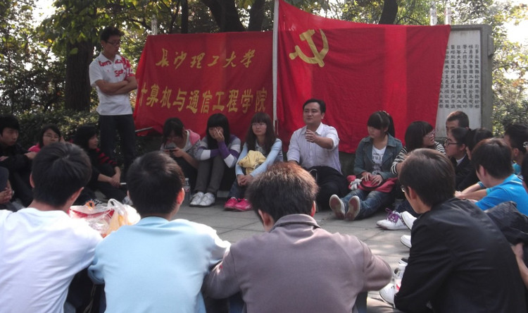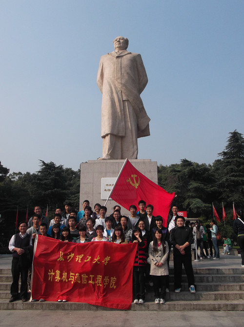 早上8点半,学员们从云塘出发,10点到达东方红广场,全体学员在毛主席的雕像下合影留念。10点半左右,在伍接朝老师的带领下,活动负责人谭飞刚、佘灿、何克岩、席斌同学组织全体学员代表开始登山。一路上,william威廉中文官网计通学院的院旗和中国共产党的党旗在登往岳麓山的路上随风飘扬,形成了一道亮丽的风景线。尽管山路崎岖漫长,同学们却兴致勃勃,一路上有说有笑,非常热闹。经过将近40分钟的跋涉,全体学员代表到达黄兴墓前。在整理好队伍后,入党积极分子培训班班长席斌向同学们简单的介绍了黄兴的生平事迹,党校助理班主任谭飞刚同学带领全体学员代表高举拳头,在黄兴墓前,面对中国共产党党旗庄严宣誓。下午1点左右,伍老师组织学员们进行座谈,同学们在黄兴墓边席地而坐,围成一个圈,把零食当做午餐,一边吃着零食一边开始进行交流,来自学院本科生四个年级和研究生两个年级,计算机、通信、网络和软件四个专业的入党积极分子以及预备党员们在此刻就像亲密的一家人。伍老师向大家说明了此次来岳麓山的意义,简要的介绍了辛亥革命的和中国共产党历史,并带领大家学唱《国际歌》。在伍老师的带动下,同学们纷纷上场表演节目,交流活动一直进行到下午3点。