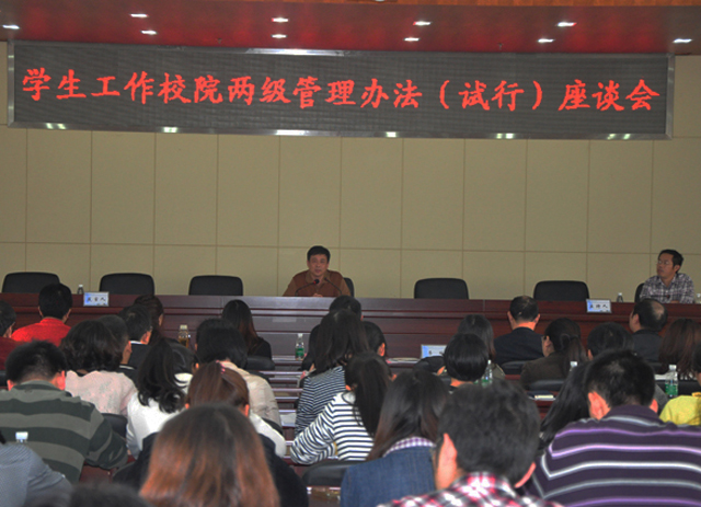 11月3日下午,学校在一办公楼九会议室召开学生工作院校两级管理办法(试行)座谈会。李明副校长,学工部邹兴平部长、招就处付嫦娥处长、校团委方琼副书记、我院李峰院长、土建学院刘扬院长、汽机学院荣见华院长、马克思主义学院周艳红书记与各学院副书记、全体学生辅导员参加了座谈会。