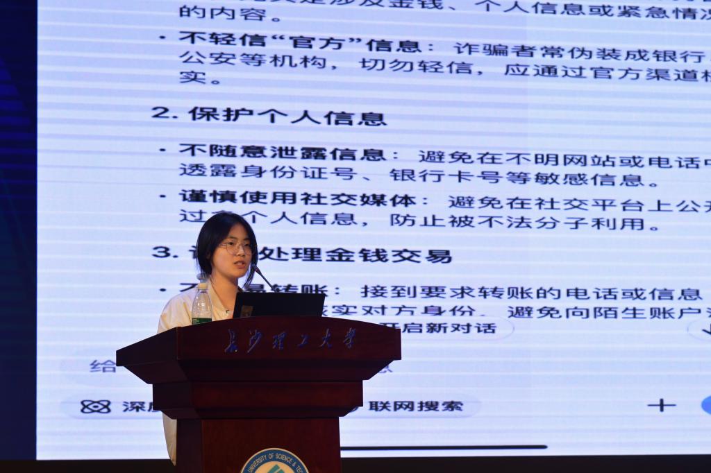 4月8日下午,计算机学院在金盆岭校区第五教学楼大礼堂举行“筑牢安全防线,共建无诈校园”知识讲座。本次讲座特邀长沙市公安局天心分局治安二大队中队长陈慧警官担任主讲,学院党委副书记王觊婧及学工办教师代表出席活动,学院学生代表参与本次学习。