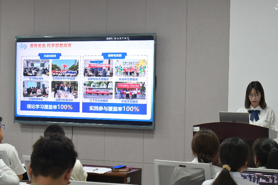 成果汇报环节中,各团支部通过数据图表进行PPT展示:在学风建设方面强化思想引领,提升专业能力;在科创竞赛方面勇于突破创新,屡创佳绩;在社会实践方面主动作为,彰显IT青年担当,充分展现了团支部的活力与风采。随后,评委围绕班级建设、团务工作、答辩表现和PPT制作等维度展开提问,既肯定亮点,也指出不足并提出改进意见。