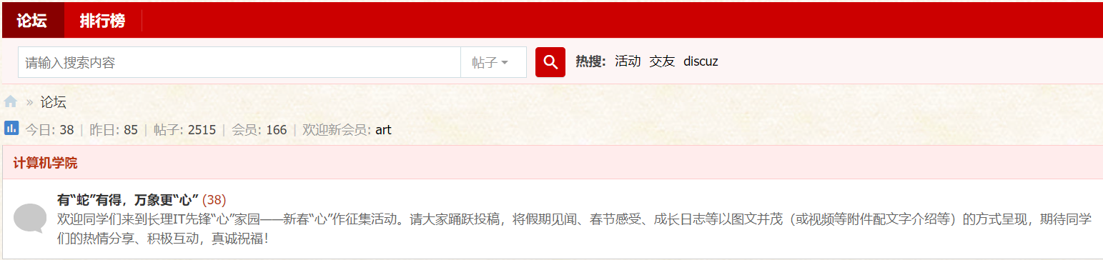 新春伊始,计算机学院学生利用专业技术优势,搭建了一个专属计算机学子的线上“心”家园, 面向学院全体同学征集新春佳节“心作”。同学们只需点击名为《IT先锋专属“心”空间》的链接,便可在论坛中直接上传发布主题帖,电脑和手机客户端均可使用。团圆年夜饭照片、全家福合影、朋友聚会纪念、祝福视频、成长见闻等……只要是想表达分享的一切,都可以在这个平台发布,图文并茂,各类文件格式不限,在“心”家园里与全院师生互动。