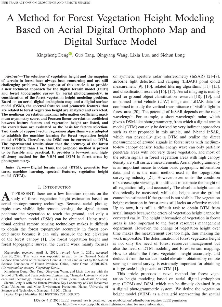 Xingsheng Deng, Guo Tang, Qingyang Wang, Lixia Luo, and Sichun Long, " A Method for Forest Vegetation Height Modeling Based on Aerial Digital Orthophoto Map and Digital Surface Model", in IEEE Transactions on Geoscience and Remote Sensing, DOI: 10.1109/TGRS.2021.3093976。(文/徐鹏 审/张锐)