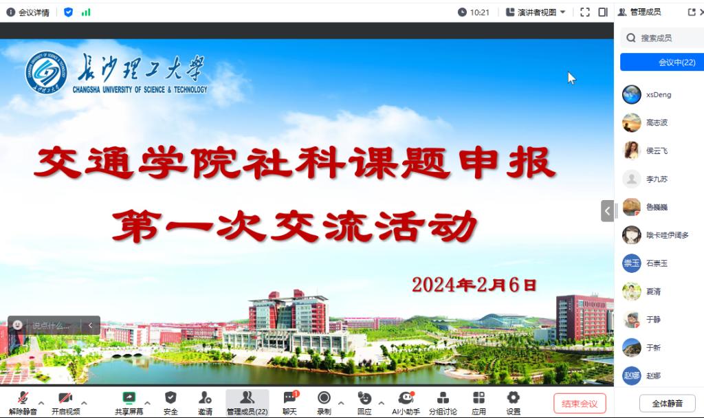 为确保2024年学院国社科及教育部人文社科项目的申报质量,2024年2月6日下午,在副院长于新、社科指导小组组长李晶晶及组员柳伍生、于静及赵娜等四位老师的共同组织下,工程管理系、交通运输系、道路系、测绘系、材料系及学工办等有意申报的老师积极参加了此次线上交流会。