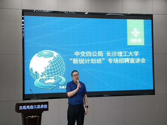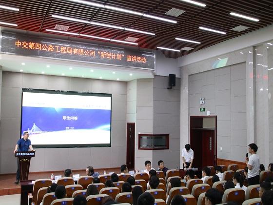 随后张小军带同学们走进中交四公局,介绍企业的文化、精品工程、获得的荣誉、薪酬待遇以及人才培养模式等,对“新锐”联培班招聘的专业、学历、成绩等相关要求进行了详细的说明。在之后的提问环节中,他对学生们提出的问题进行一一解答,并加以拓展作出相应补充。宣讲会结束后,80余名学生递交简历参与了“新锐”联培班的招聘面试。