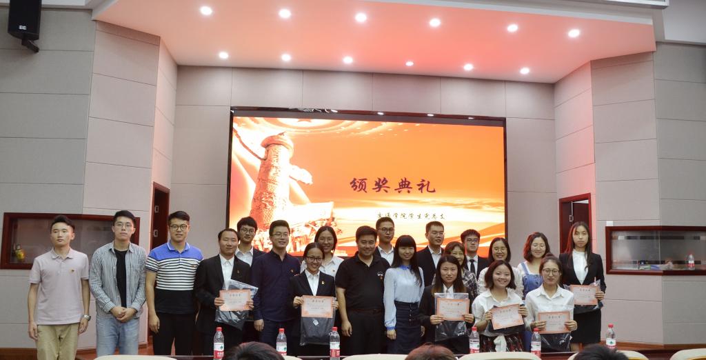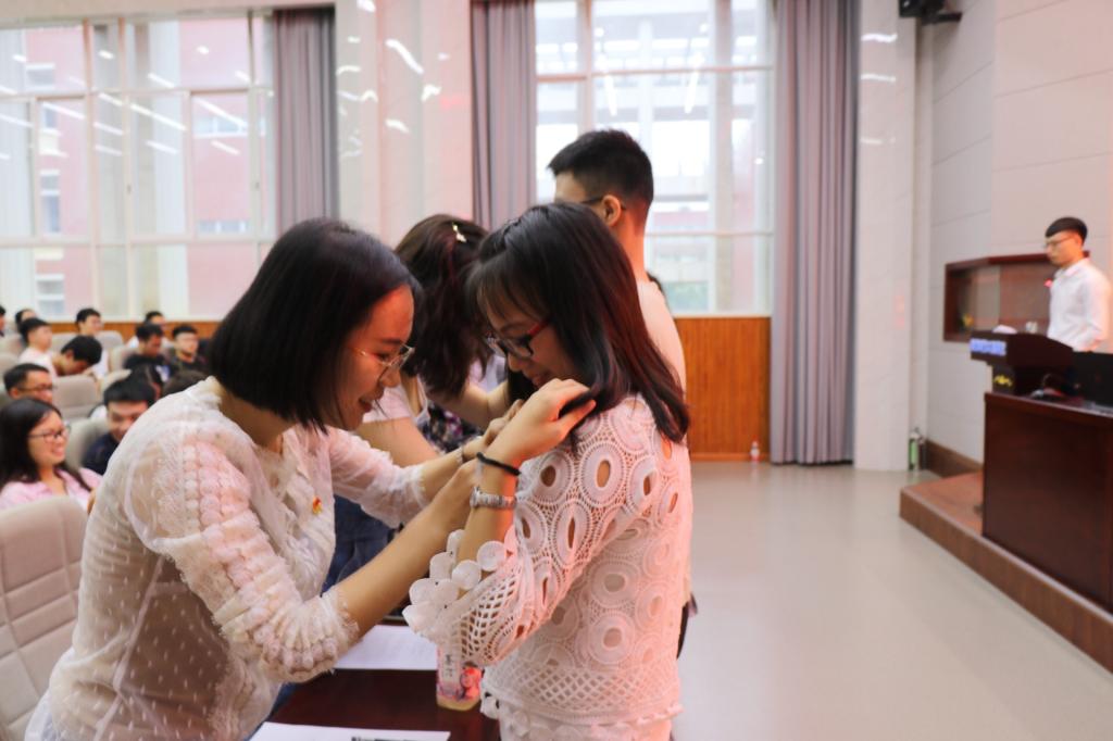 在党员同志的共同见证下,到场老师分别为新发展的52名党员依次授徽并给与嘱咐与祝福。其后,本科生第二党支部刘轩宁同志领誓,全体党员面向党旗并庄严宣誓。随后,学院为本学年度优秀党务工作者颁发受聘证书,肯定他们在学生党建工作中的出色表现。在最后的下班党员(干部)展示环节中,18个班级的下班们依次上台演讲。从所下班级同学参与拍摄的表白视频,再到下班们精心制作的PPT以及富有活力的演讲,观众深切体会到2017级同学与下班们之间的深情厚谊。颇有成效的班级建设、团结友爱的温情瞬间、生动活泼的逗趣日常,下班们用心向观众展示了他们这一年来的辛勤付出和良好风采。活动最后,彭霞总结发言,她对下班党员(干部)一年的付出表示感谢,并鼓励有意担任2018级下班的党员同志学习他们的优秀经验,发挥党员的先锋模范作用,积极展示党员风采,敬业奉献、服务群众。