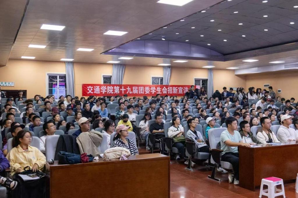 10月15日晚,交通学院于金盆岭校区4教报告厅举行第十九届团委、学生会招新宣讲会。交通学院团委学生会全体学生干部及近三百名2025级新生参加会议。宣讲会由轮值主席尉熙圆主持。