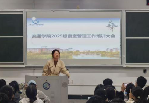 为加强新生寝室管理,营造安全、文明、和谐的寝室环境,交通学院于金盆岭校区12教615教室召开寝室管理工作培训大会。会议由年级辅导员李乐天老师主持,2025级全体寝室室长以及年级工作组生活组成员参与培训。