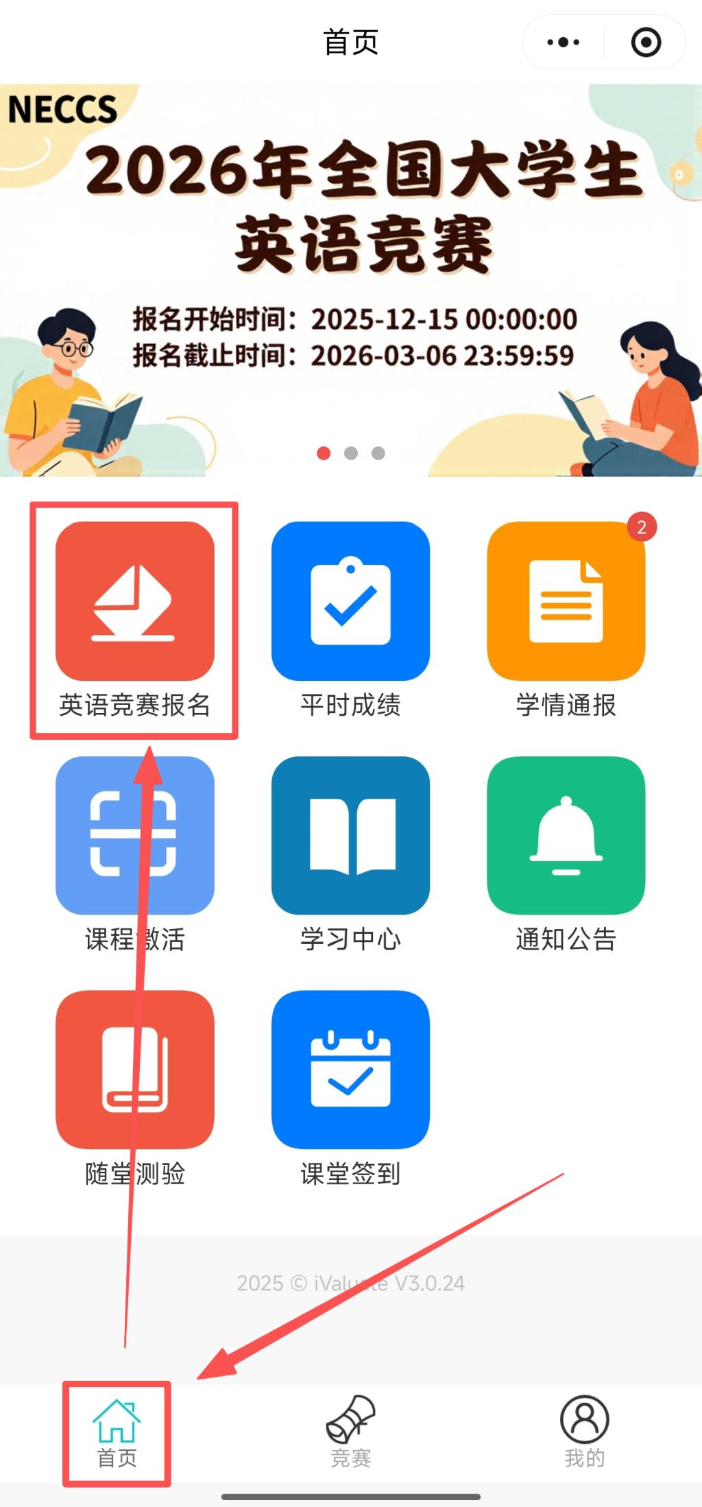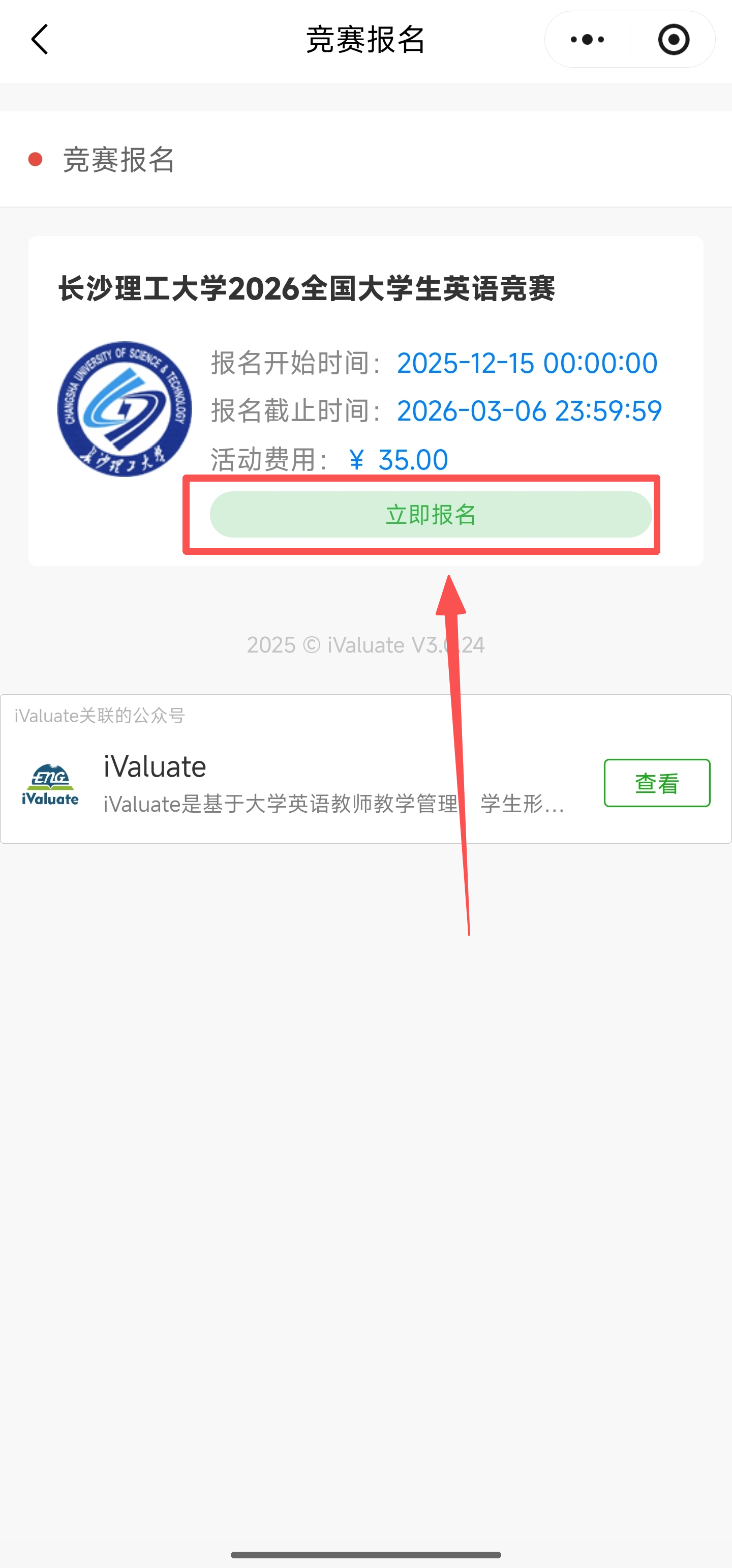 1、 扫码关注“iValuate”微信公众号,点击公众号的“英语竞赛”菜单打开“iValuate”小程序,或者通过其他方式打开“iValuate”小程序。