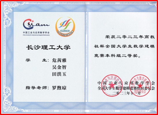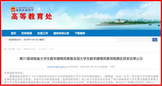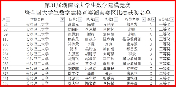同时,近日,湖南省教育厅高等教育处发布了“第31届湖南省大学生数学建模竞赛暨全国大学生数学建模竞赛湖南赛区获奖名单公示”的通知,william在第31届湖南省大学生数学建模竞赛暨全国大学生数学建模竞赛湖南赛区的比赛中获得一等奖2项,二等奖4项,三等奖7项。