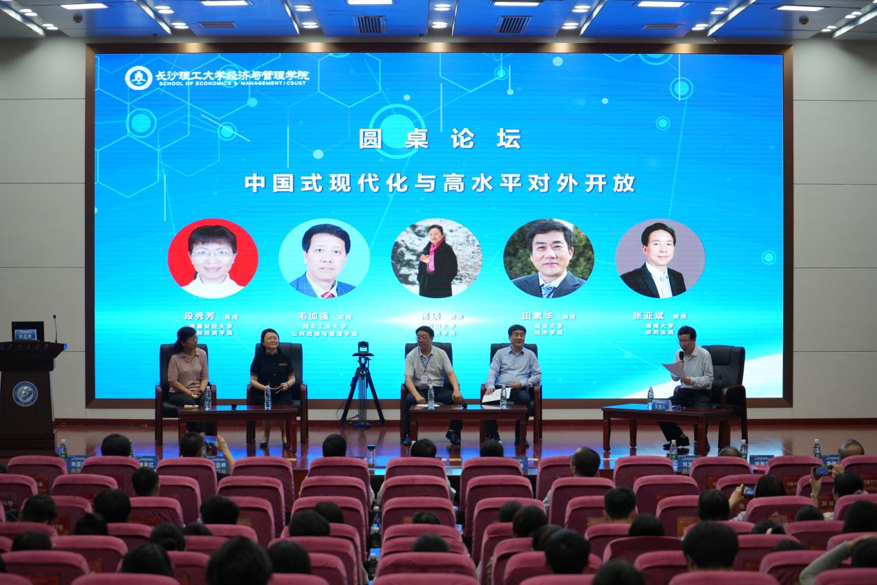 圆桌论坛环节共有三场。第一场圆桌论坛主题为“中国式现代化与高水平对外开放”,由湖南大学研究生院院长张亚斌教授主持。复旦大学田素华教授、四川大学蒋英教授、西北工业大学毛加强教授、新疆财经大学段秀芳教授等4位专家展开热烈讨论。专家们就中国式现代化、高水平开放的内涵进行解读,特别以新疆为例,对其高水平开放和高质量发展平台条件评价,一致认为对外开放是推动现代化的必然选择,高水平对外开放为中国式现代化提供制度供给。新发展格局是一个开放的格局,中国式现代化一定是开放式的现代化。