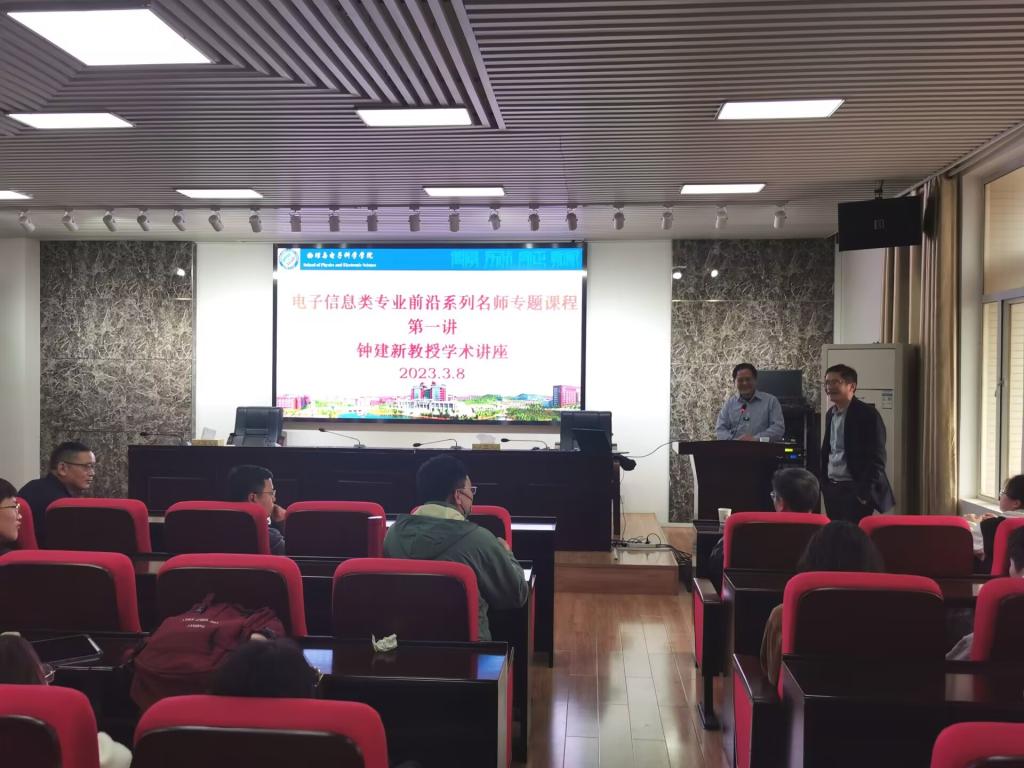 物理与电子科学学院“专业前沿系列名师专题课”于3月8日15点30分在云塘校区理科楼B-413拉开序幕。湘潭大学钟建新教授应邀来william作为课程第一讲的主讲人。学院党委书记张国强、副院长(主持工作)张卫兵、副院长范志强、校督导团团长唐立军教授,与电子系的师生们共计120余人一起聆听了专题课程。专题课由物电学院副院长(主持工作)张卫兵主持。