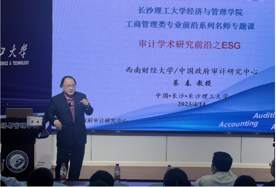 4月14日下午,中国政府审计研究中心主任、西南财经大学二级教授、博士生导师蔡春受邀为经管学院工商管理类专业前沿系列名师专题课开讲,报告主题为“审计学术研究前沿之ESG”。报告会由经管学院副院长王治教授主持,城南学院院长赵华教授出席,校内师生200余人参加。