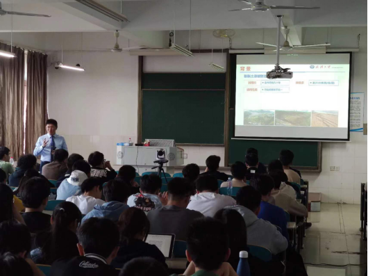 授课内容包括三部分:一是膨胀土的基本性质;二是土工合成材料的种类与功能;三是几种土工合成材料用于稳定公路膨胀土边坡技术的理论与工程应用。邹维列教授首先以膨胀土分布特点及其危害为切入点,介绍了膨胀土边坡治理的主要历史过程,突出了膨胀土“吸水膨胀、失水收缩”特点给实际工程带来的巨大挑战;接着,以稳定膨胀土边坡需解决的几个关键问题入手,引入了土工合成材料,并详细阐述了土工合成材料的特点及应用形式;最后,以具体工程实例向同学们展示了土工泡沫、袋装土、格栅加筋土和玻璃钢螺旋锚等典型土工合成材料在膨胀土边坡治理中的应用。