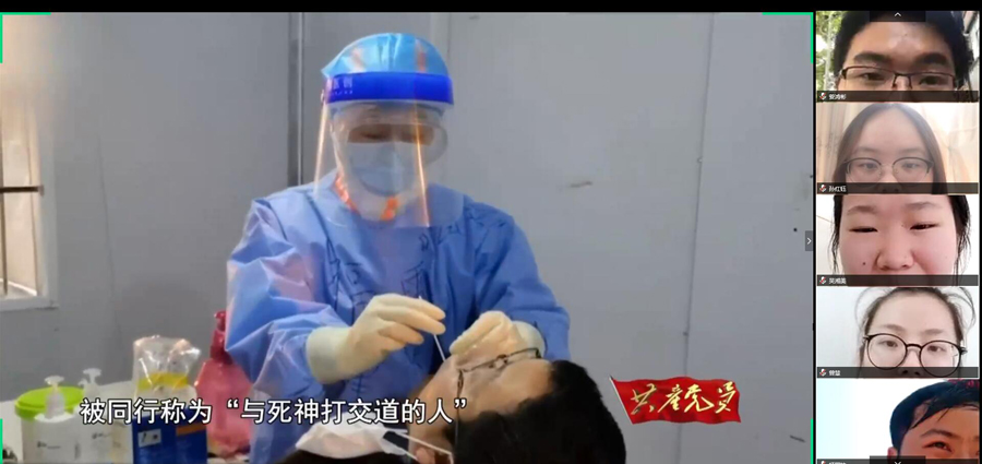 学生党支部全体党员共同观看了“英雄无悔,山河无恙”记录视频,致敬全体抗疫英雄。此次抗击疫情行动背后,有许许多多不惧风雨、无私奉献的感人事迹。“60分贝暖医”江学庆、“准爸爸”彭银华、“与死神打交道的人”丁敏等等。当疫情来袭,无数的医护人员毅然坚守在疫情的“风暴眼”,践行“你若生死相托,我必全力以赴”医者仁心的承诺。在这个特殊的春天,无数优秀的中华儿女投身到抗击疫情的第一线,他们忘我奉献、无悔冲锋,为的是家国安好、山河无恙,他们是这个新时代的英雄。