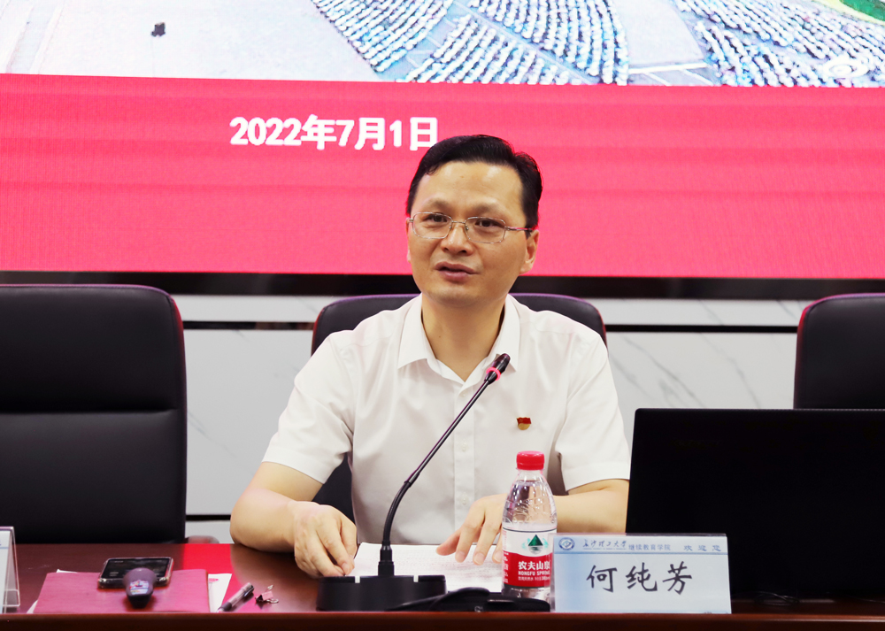 喜迎二十大,永远跟党走,奋进新征程。7月1日上午,继续教育学院召开“七一”表彰大会暨专题党课。党总支书记何纯芳,院长邹兴平,正处级纪检员易贵民,总支副书记谢士成,副院长谢朝华、向英、刘英姿,全院教职工(含外聘职工和合作机构)党员、学生党员代表参加大会。会议由副书记谢士成主持。