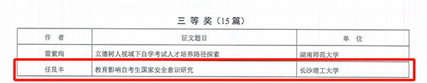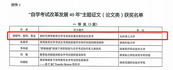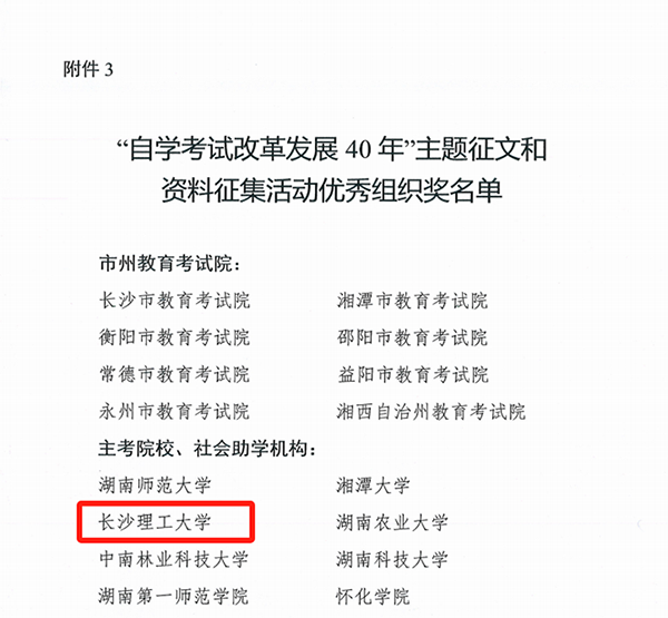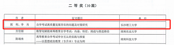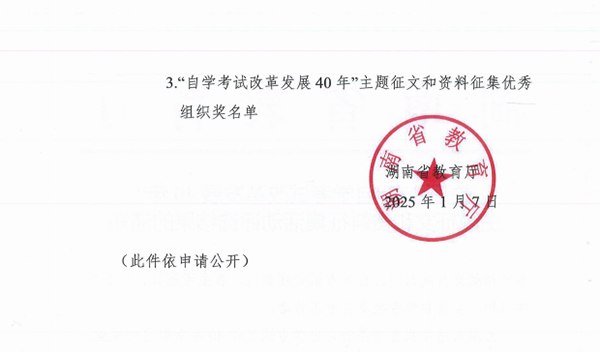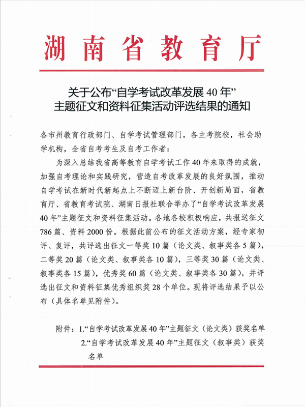 省教育厅发布《关于公布“自学考试改革发展40年”主题征文和资料征集活动评选结果的通知》,正式公布“自学考试改革发展40年”主题征文和资料征集活动评选结果,我院荣获“自学考试改革发展40年”主题征文和资料征集活动优秀组织奖1项,主题征文一等奖1项、主题征文二等奖1项、主题征文三等奖1项、主题征文优秀奖1项,总共获得5项殊荣。2025年1月8日湖南省教育厅组织召开湖南省高等教育自学考试高质量发展会议,在颁奖环节为此次活动的获奖单位和个人举行了隆重的颁奖仪式。