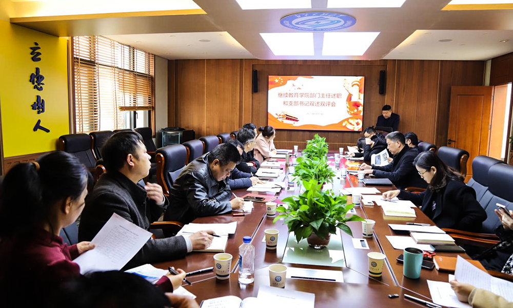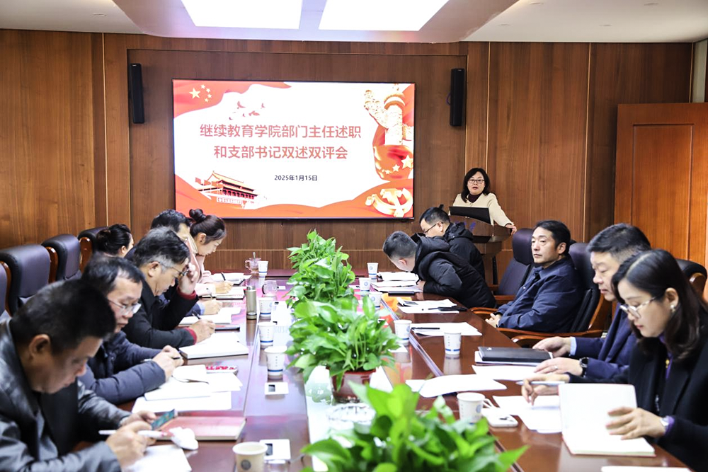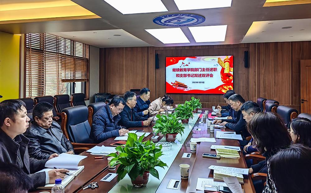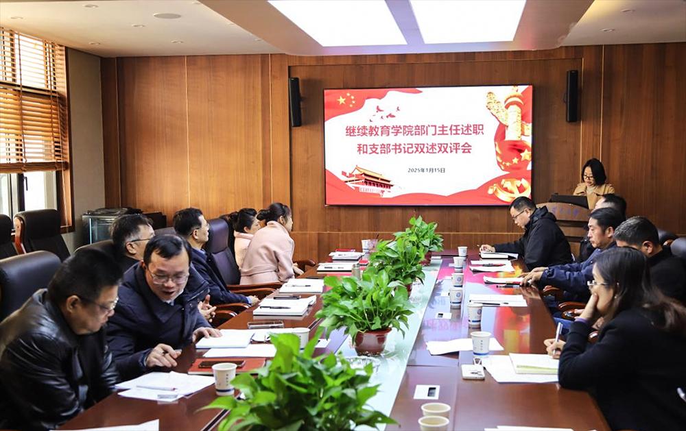 为深入学习贯彻习近平新时代中国特色社会主义思想,充分发挥党建引领作用,推动继续教育学院高质量发展迈向新台阶,同时增进学院各部门间的沟通交流、互学互鉴,形成携手共进的良好局面,2025年1月15日上午9点,继续教育学院在15教4楼会议室开展2024年度党支部书记双述双评暨部门主任工作述职交流会。学院领导班子成员和各部门主任参加会议,院长邹兴平主持。