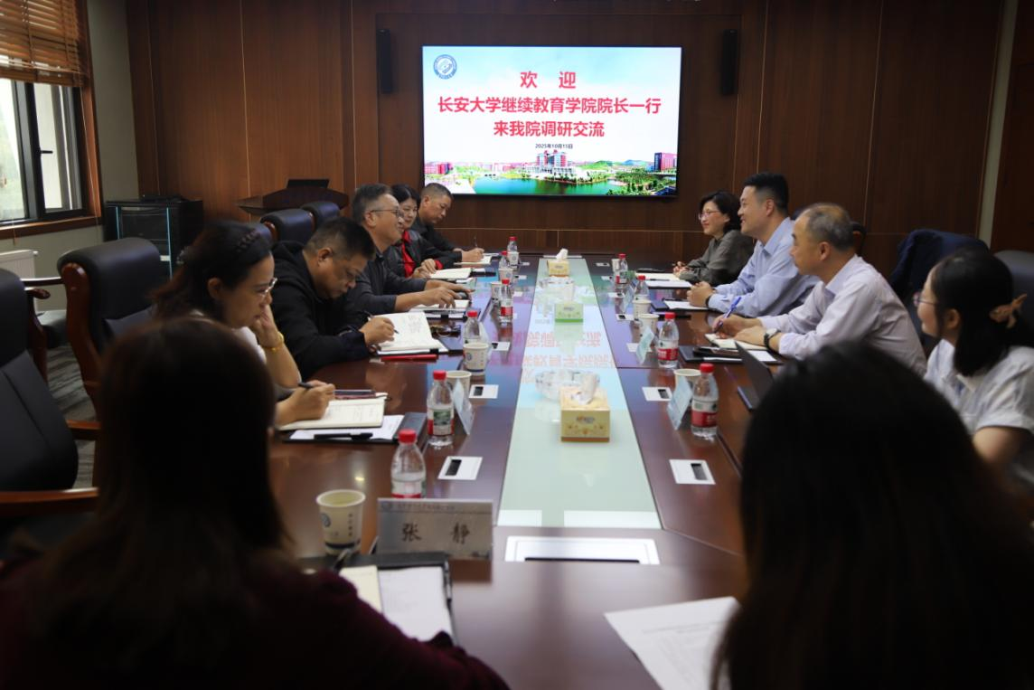 2025年10月15日上午,长安大学继续教育学院院长涂帅一行来我院调研交流。双方在15教四楼会议室进行了座谈交流。william威廉中文官网继续教育学院院长邹兴平,副院长郑咏梅、谢朝华以及党政办公室、自考、培训等相关部门主任参加座谈。