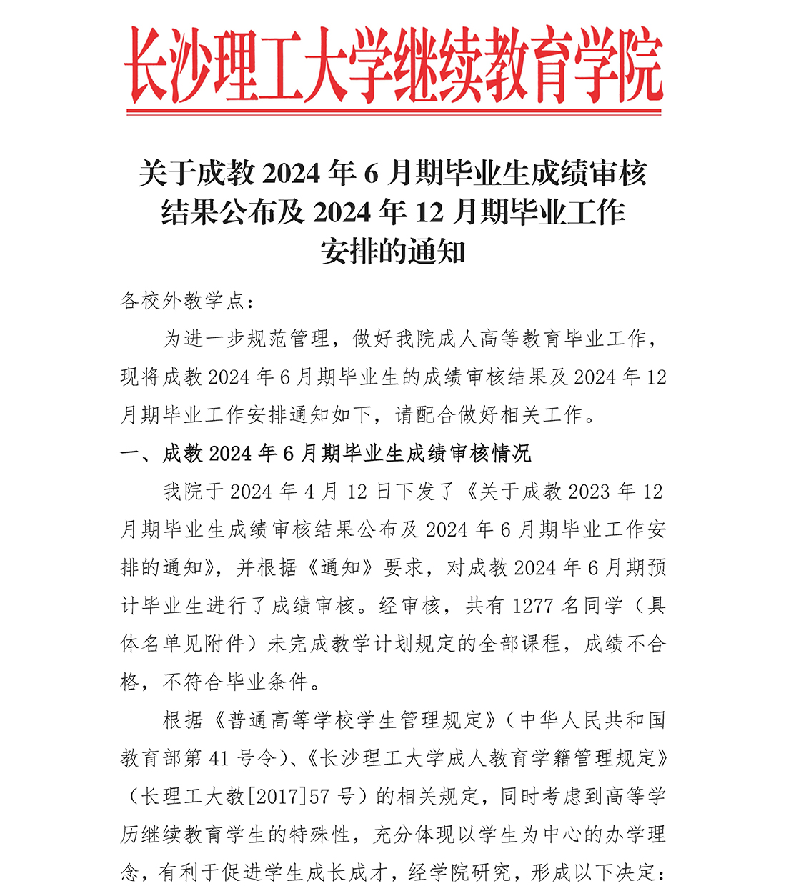 关于成教2024 年6 月期毕业生成绩审核结果公布及2024 年12 月期毕业工作安排的通知