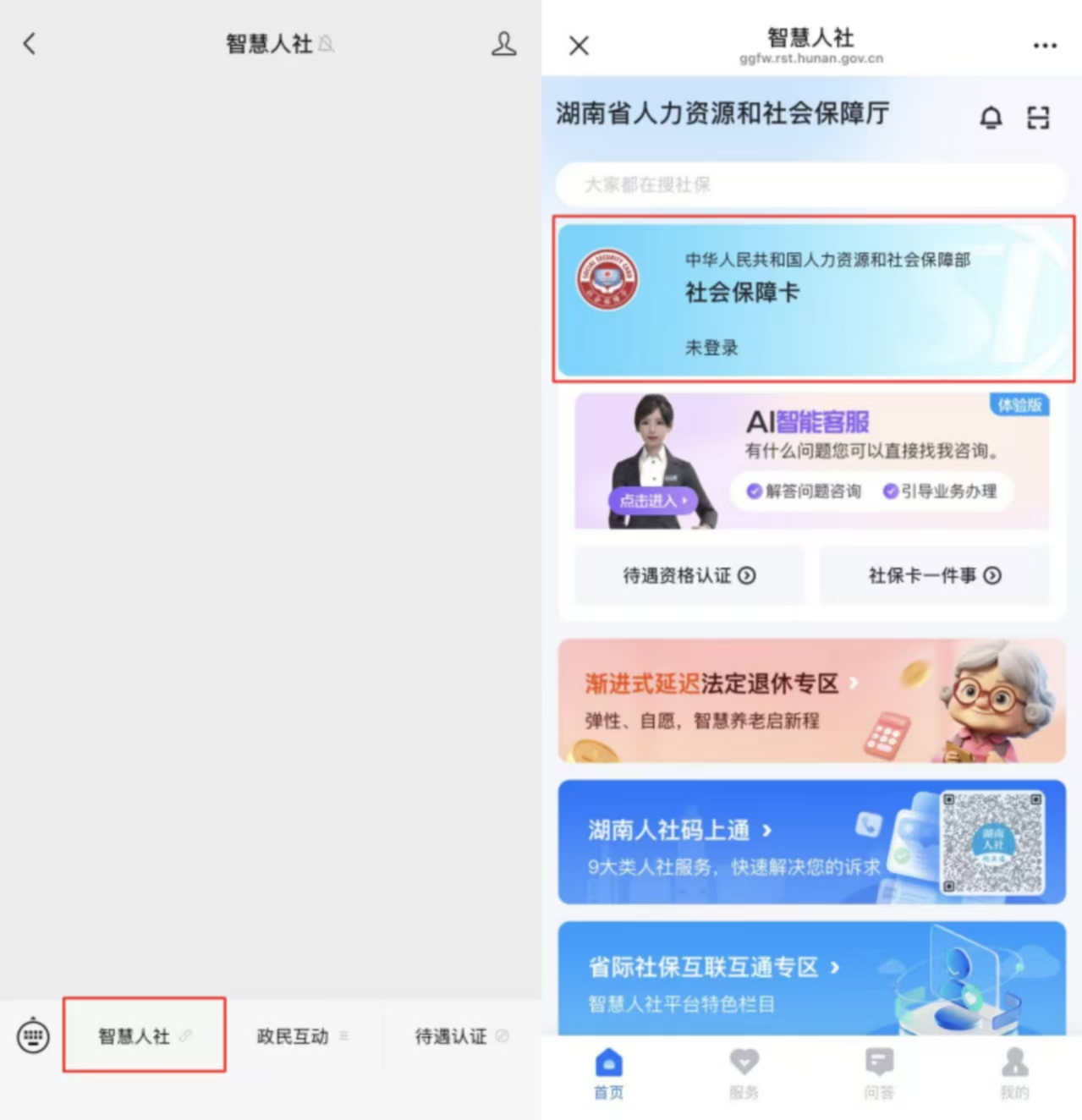 2、点击底部【智慧人社】,选择“社会保障卡”;