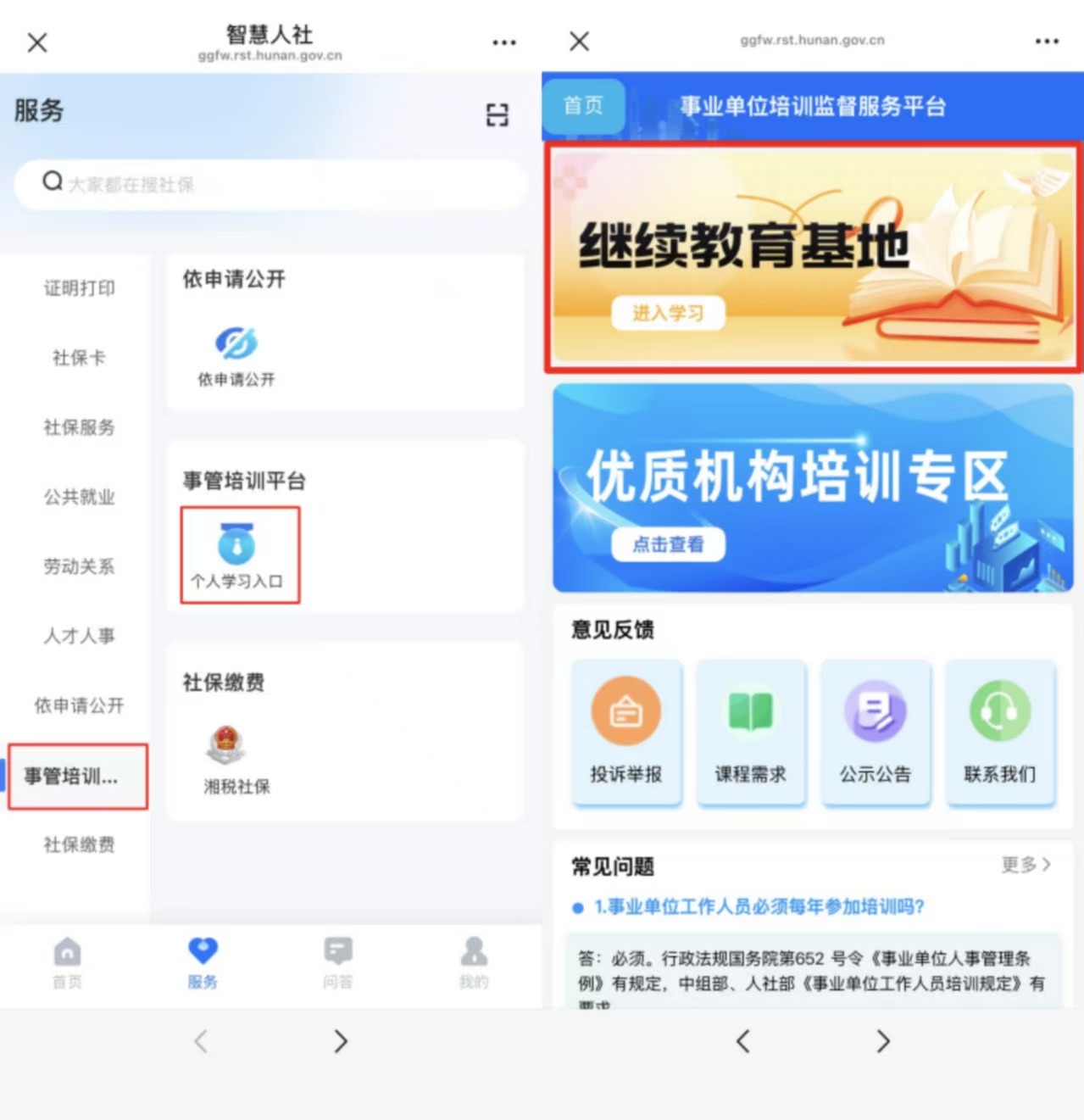 5、点击【服务】,在“事管培训平台”选【个人学习入口】,进入继续教育基地;