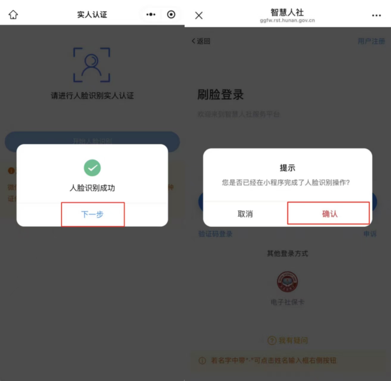4、人脸识别通过后点击【下一步】,确认完成登录;
