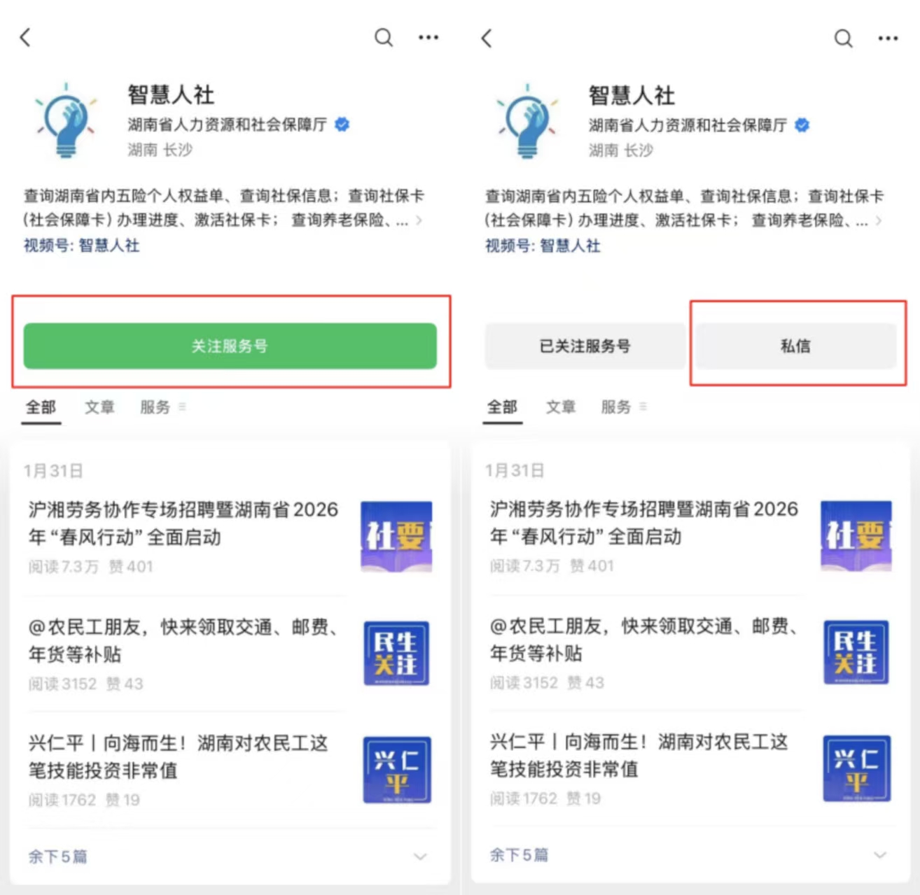 1、微信搜索关注【智慧人社】服务号,然后点击【私信】按钮;