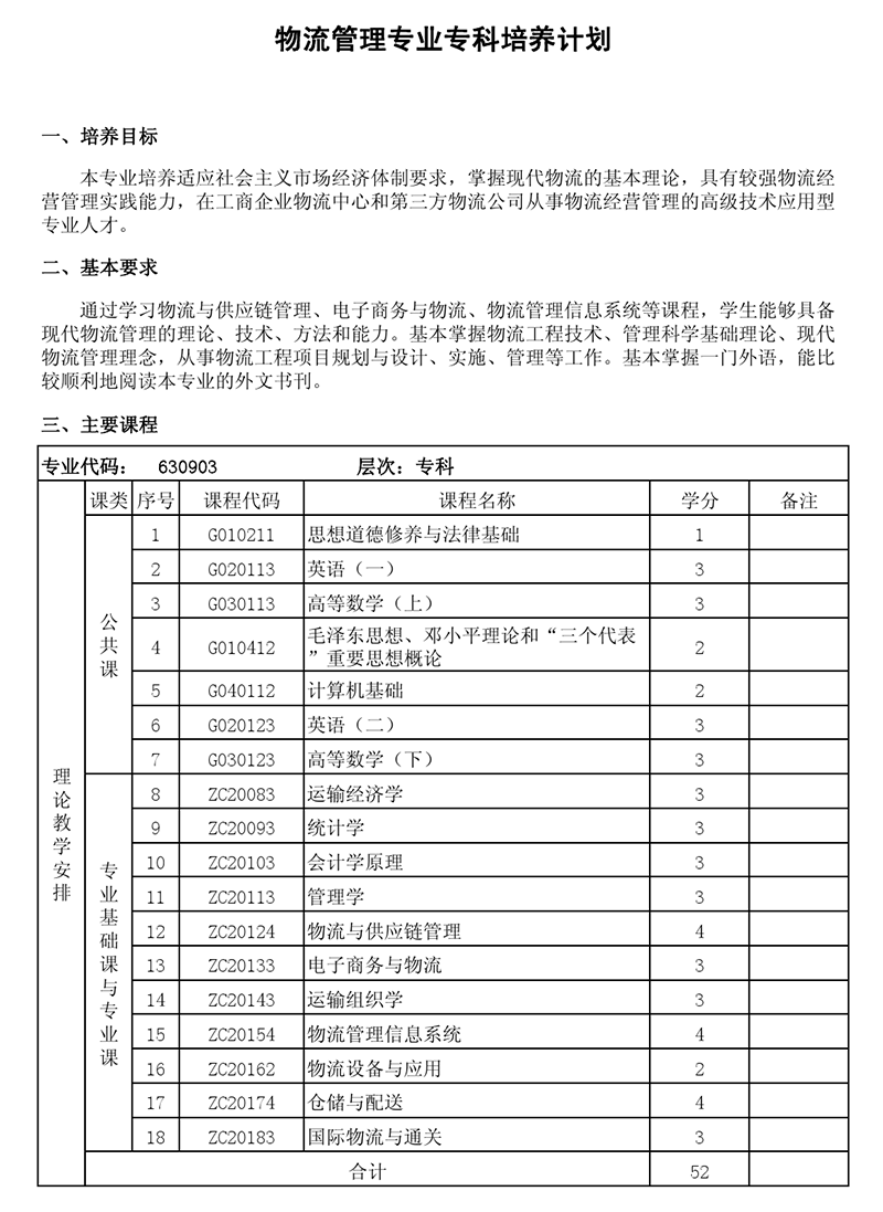 专科培养计划-专业代码:630903 物流管理专业