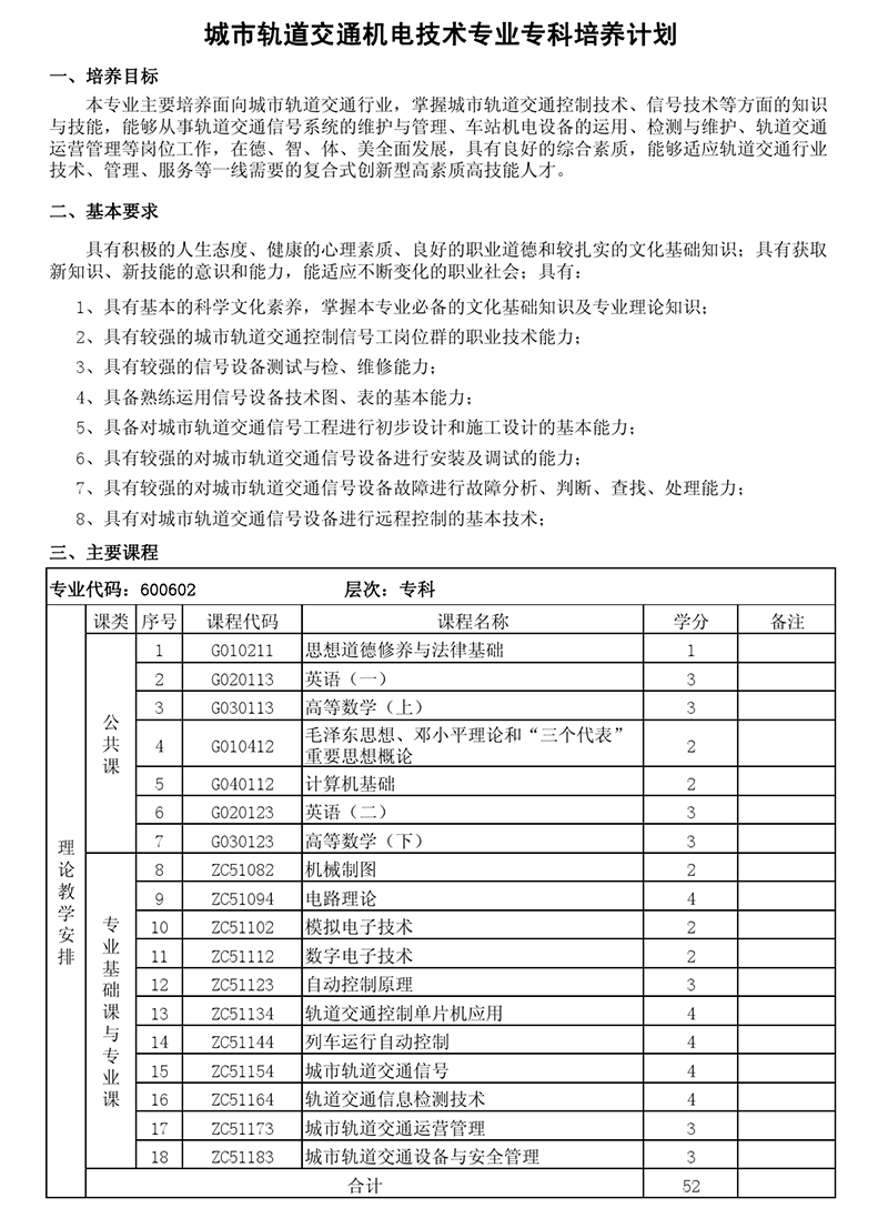 专科培养计划-专业代码:600602 城市轨道交通机电技术专业
