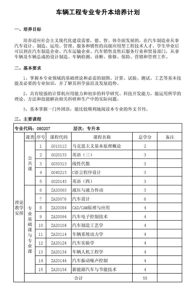 本科培养计划-专业代码:080207 车辆工程专业