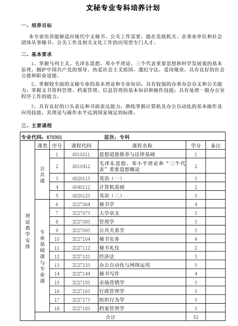 专科培养计划-专业代码:670301 文秘专业
