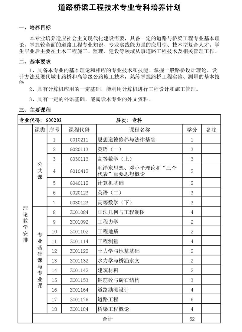 专科培养计划-专业代码:600202 道路桥梁工程技术专业