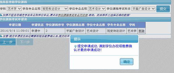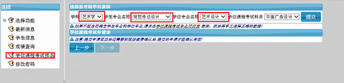 选择正确的学位专业后再选择“学位课程考试科目”,选择需要报名的课程,然后点击“提交”,所有需要申请的学位课程提交后必须现场确认缴费方能最终生效