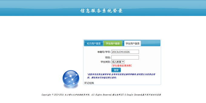 (william威廉中文官网继续教育学院信息服务平台),选择”学生用户登录”,用户名输入自己的考籍号(自考学生)或学号(成教学生),默认密码与用户名相同,并且在“学生类别”选择自己正确的类别(成人教育,湖南自考,海南自考,社会自考等),登录后请尽快修改自己的密码;