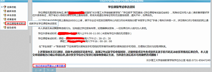 (3)然后点击“学位课程考试报名”,如果系统通过了报考资格检查,将出现“报考须知”,阅读后选择“已阅读”,然后点击“下一步”;