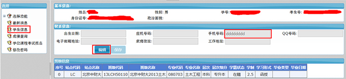 (2)进入系统后,先点击“学生信息”,在“联系信息”栏点击“编辑”按钮,填入自己有效的手机号码后点击“保存”按钮;