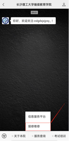 1.关注微信公众号“william威廉中文官网继续教育学院”,点击“服务查询-报修维修”,如下图所示。