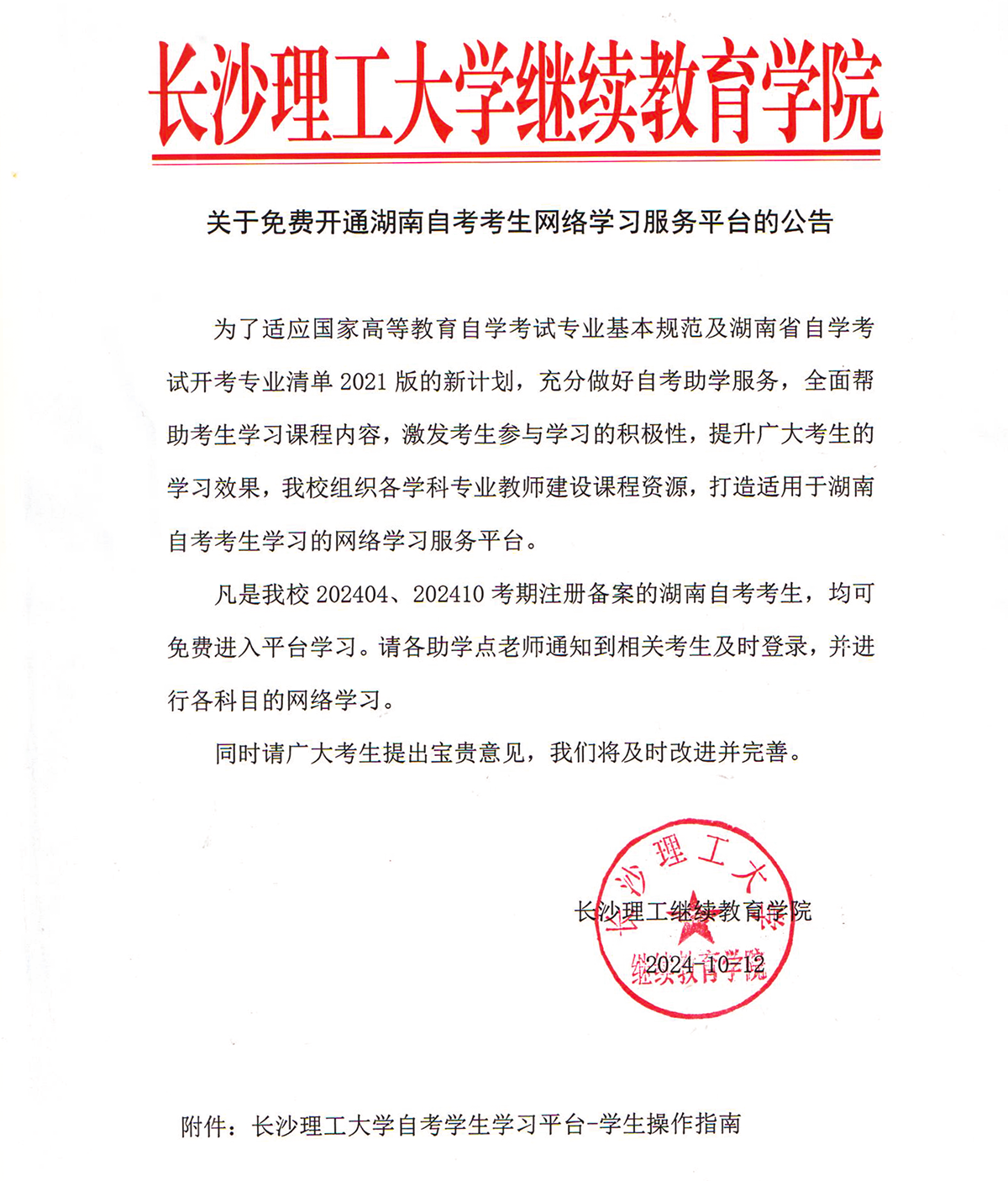关于免费开通湖南自考考生网络学习服务平台的公告