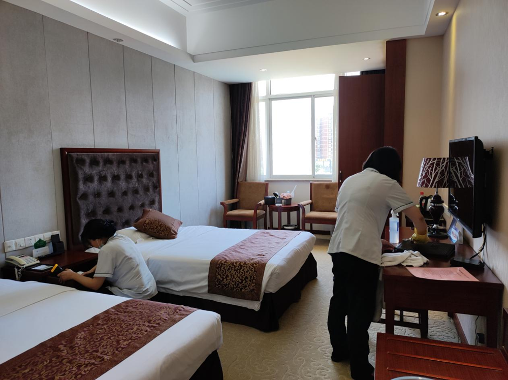 1、总经理谢治强带领管理人员对即将入住的一百余间房间进行全面检查,包括房间设施、照明、墙面、地面、淋浴间等,楼层班组对房间进行精细洒扫、抹尘、消杀,并联合维保部按要求将原来的房型布置成三人间,添加床位,增补物品,对房间设施设备进行修护,有条不紊地进行入住前的准备工作。