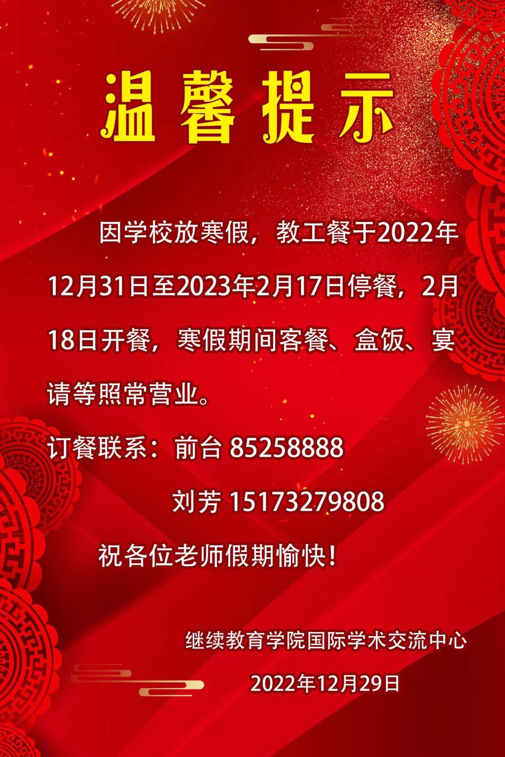 因学校放寒假,教工餐于2022年12月31日至2023年2月17日停餐,2月18日开餐,寒假期间客餐、盒饭、宴请等照常营业;订餐联系:前台85258888/刘芳15173279808;祝各位老师假期愉快!